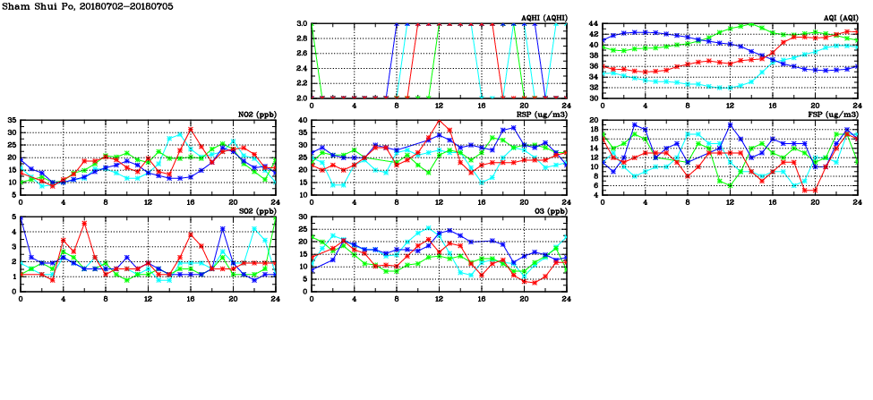 | Air Quality Data Time Series in Sham Shui Po (2018/07/05) | ( Line colors: Day -3 Day -2 Day -1 Current day ) | 2D Map Current AQHI |