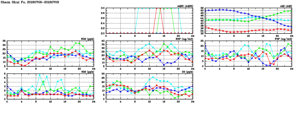 | Air Quality Data Time Series in Sham Shui Po (2018/07/09) | ( Line colors: Day -3 Day -2 Day -1 Current day ) | 2D Map Current AQHI |