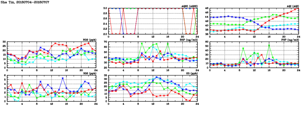 | Air Quality Data Time Series in Sha Tin (2018/07/07) | ( Line colors: Day -3 Day -2 Day -1 Current day ) | 2D Map Current AQHI |