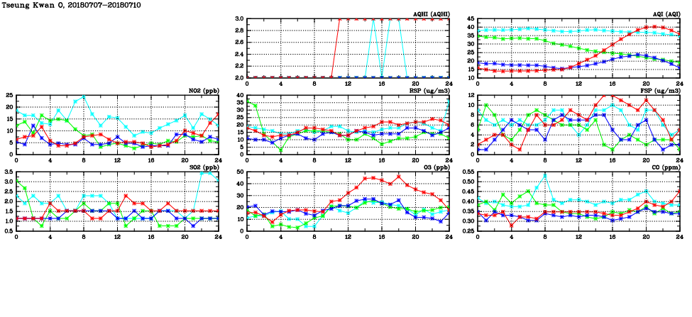 | Air Quality Data Time Series in Tseung Kwan O (2018/07/10) | ( Line colors: Day -3 Day -2 Day -1 Current day ) | 2D Map Current AQHI |