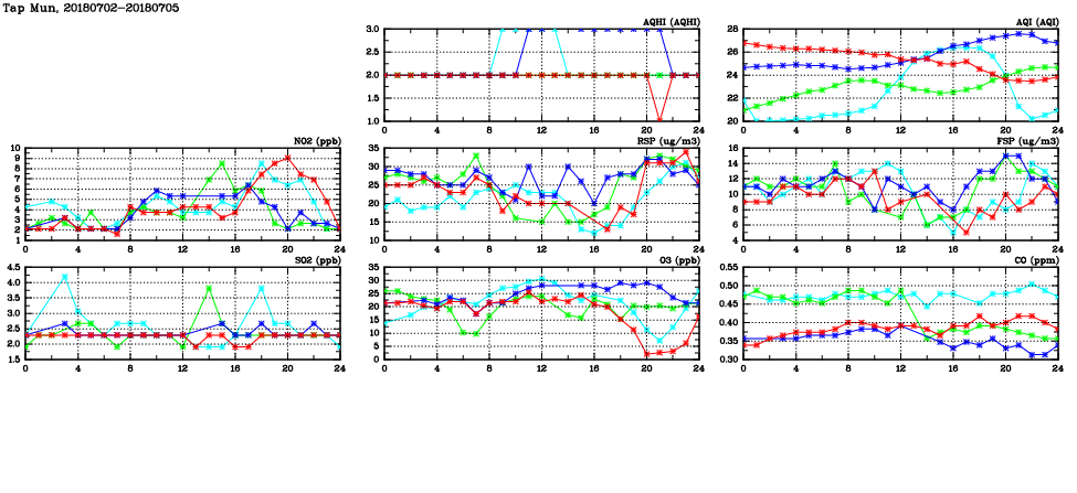 | Air Quality Data Time Series in Tap Mun (2018/07/05) | ( Line colors: Day -3 Day -2 Day -1 Current day ) | 2D Map Current AQHI |