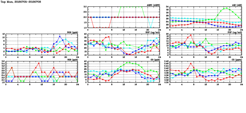 | Air Quality Data Time Series in Tap Mun (2018/07/08) | ( Line colors: Day -3 Day -2 Day -1 Current day ) | 2D Map Current AQHI |