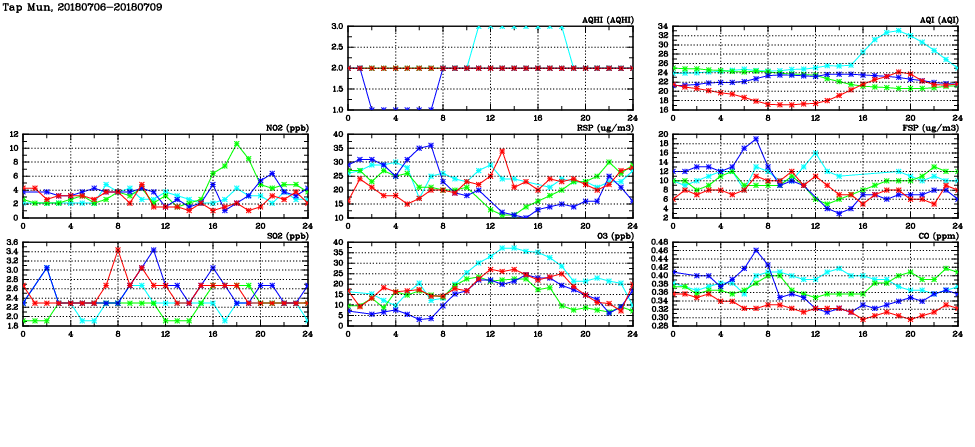 | Air Quality Data Time Series in Tap Mun (2018/07/09) | ( Line colors: Day -3 Day -2 Day -1 Current day ) | 2D Map Current AQHI |