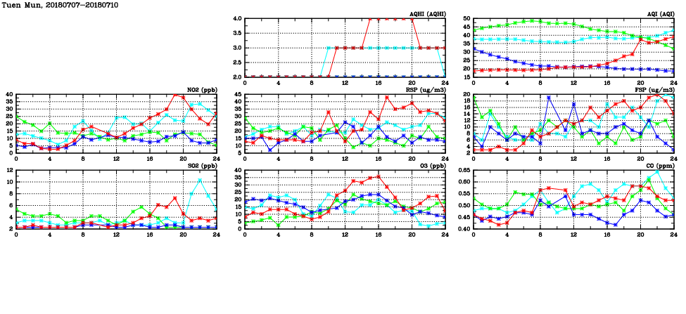 | Air Quality Data Time Series in Tuen Mun (2018/07/10) | ( Line colors: Day -3 Day -2 Day -1 Current day ) | 2D Map Current AQHI |