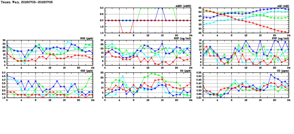 | Air Quality Data Time Series in Tsuen Wan (2018/07/08) | ( Line colors: Day -3 Day -2 Day -1 Current day ) | 2D Map Current AQHI |