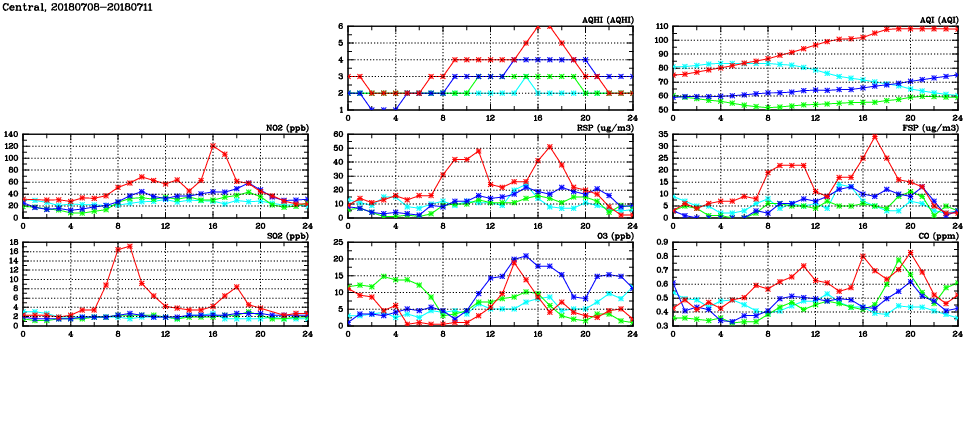 | Air Quality Data Time Series in Central (2018/07/11) | ( Line colors: Day -3 Day -2 Day -1 Current day ) | 2D Map Current AQHI |