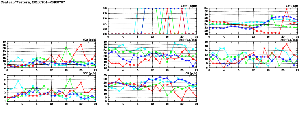 | Air Quality Data Time Series in Central/Western (2018/07/07) | ( Line colors: Day -3 Day -2 Day -1 Current day ) | 2D Map Current AQHI |