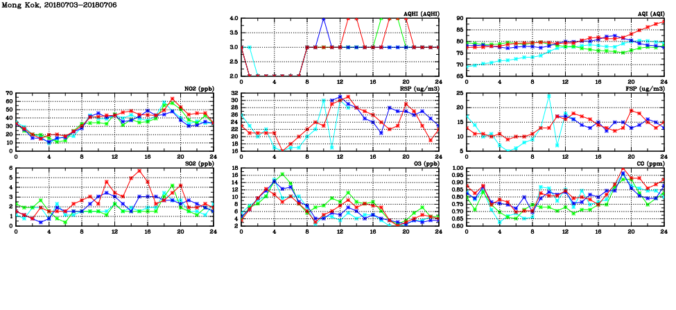 | Air Quality Data Time Series in Mong Kok (2018/07/06) | ( Line colors: Day -3 Day -2 Day -1 Current day ) | 2D Map Current AQHI |