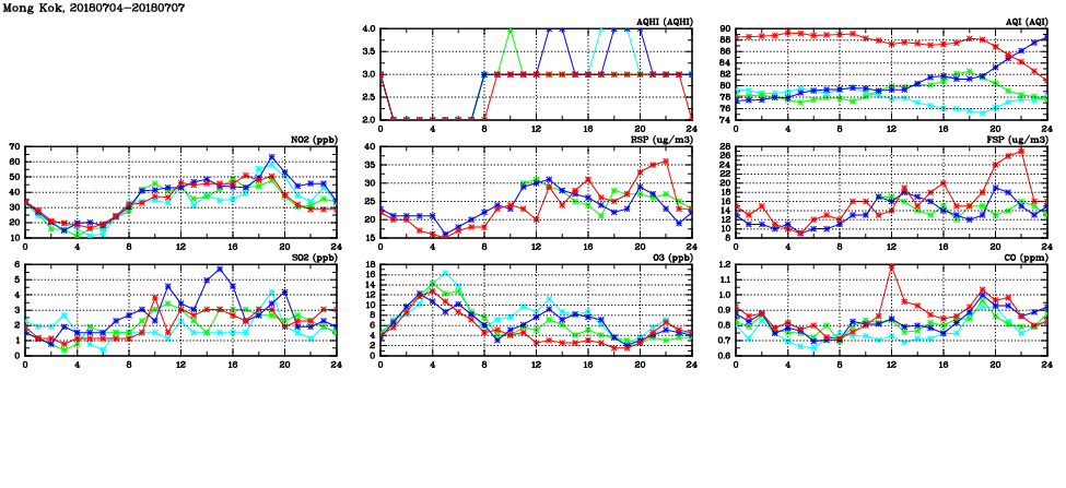 | Air Quality Data Time Series in Mong Kok (2018/07/07) | ( Line colors: Day -3 Day -2 Day -1 Current day ) | 2D Map Current AQHI |