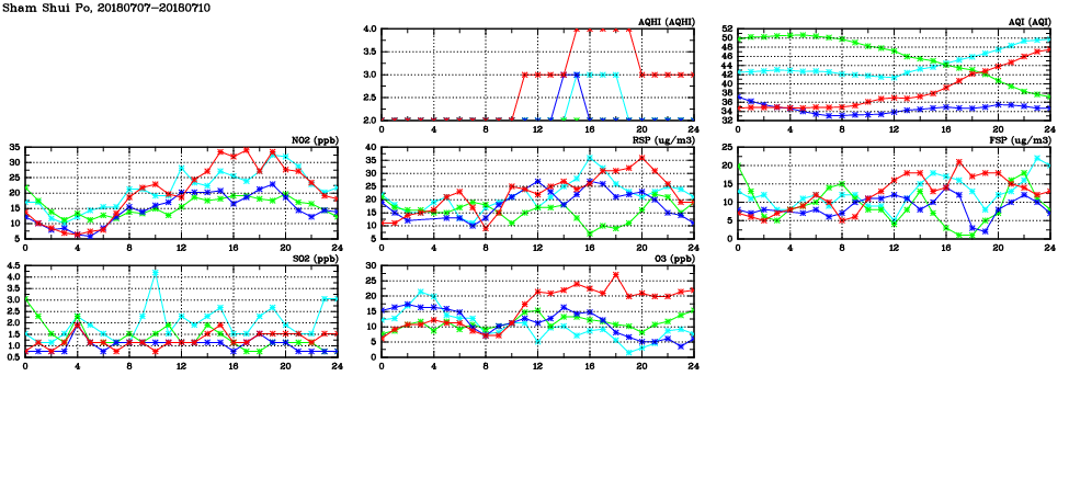 | Air Quality Data Time Series in Sham Shui Po (2018/07/10) | ( Line colors: Day -3 Day -2 Day -1 Current day ) | 2D Map Current AQHI |