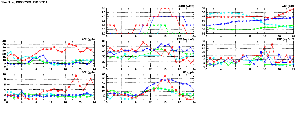 | Air Quality Data Time Series in Sha Tin (2018/07/11) | ( Line colors: Day -3 Day -2 Day -1 Current day ) | 2D Map Current AQHI |