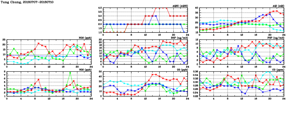 | Air Quality Data Time Series in Tung Chung (2018/07/10) | ( Line colors: Day -3 Day -2 Day -1 Current day ) | 2D Map Current AQHI |
