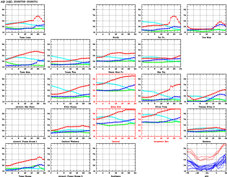 | Air Quality Data Time Series for AQI (2018/07/11) | ( Line colors: Day -3 Day -2 Day -1 Current day ) | 2D Map Current AQHI |