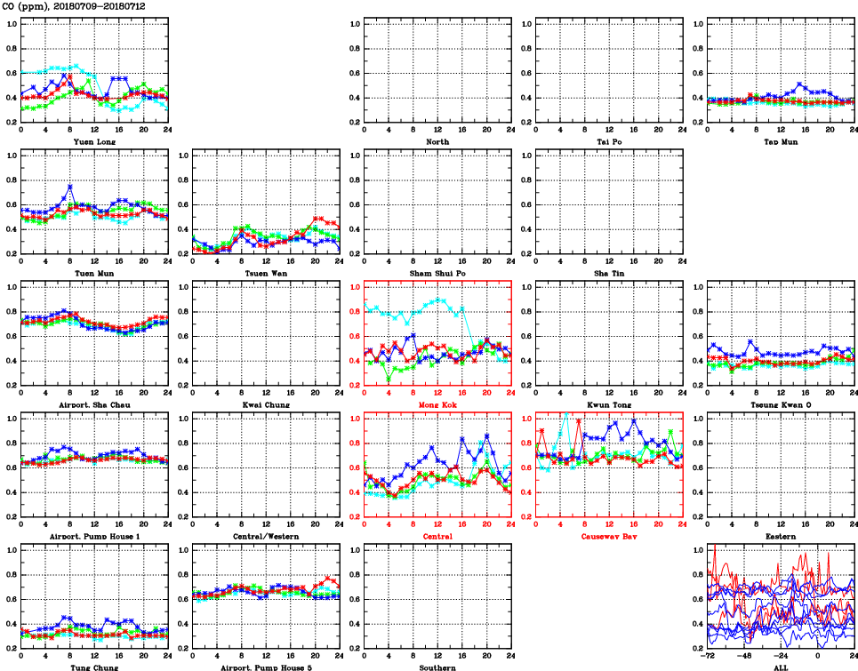 | Air Quality Data Time Series for CO (2018/07/12) | ( Line colors: Day -3 Day -2 Day -1 Current day ) | 2D Map Current AQHI |