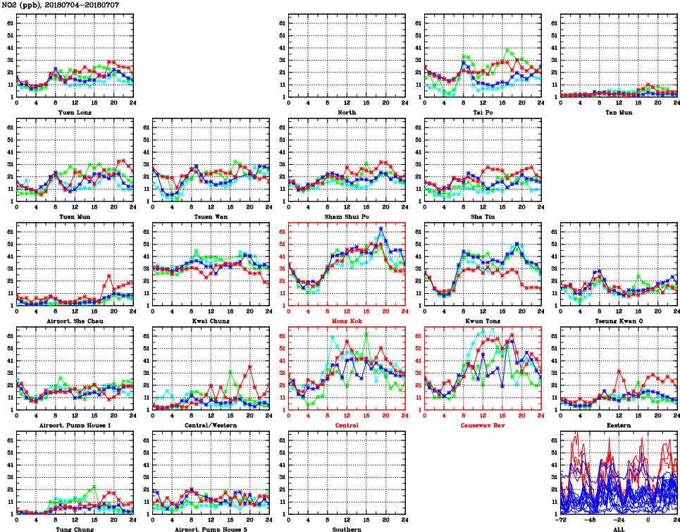 | Air Quality Data Time Series for NO2 (2018/07/07) | ( Line colors: Day -3 Day -2 Day -1 Current day ) | 2D Map Current AQHI |