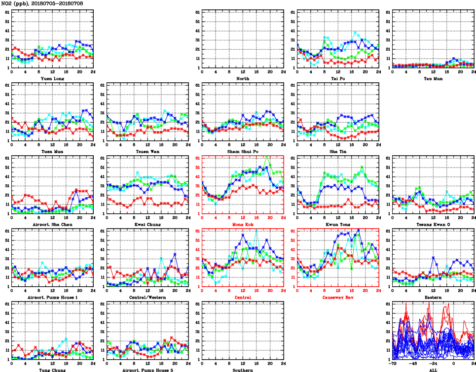 | Air Quality Data Time Series for NO2 (2018/07/08) | ( Line colors: Day -3 Day -2 Day -1 Current day ) | 2D Map Current AQHI |