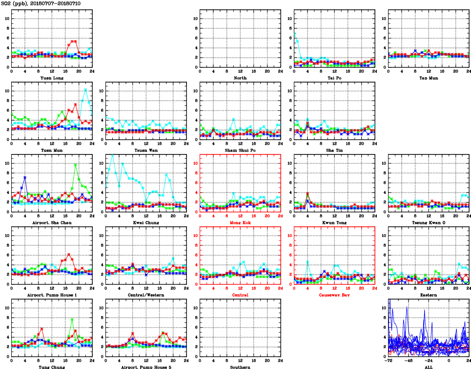 | Air Quality Data Time Series for SO2 (2018/07/10) | ( Line colors: Day -3 Day -2 Day -1 Current day ) | 2D Map Current AQHI |
