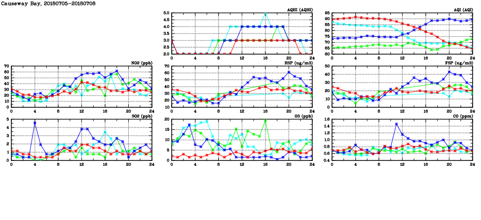 | Air Quality Data Time Series in Causeway Bay (2018/07/08) | ( Line colors: Day -3 Day -2 Day -1 Current day ) | 2D Map Current AQHI |