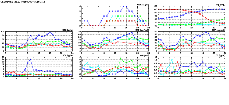 | Air Quality Data Time Series in Causeway Bay (2018/07/12) | ( Line colors: Day -3 Day -2 Day -1 Current day ) | 2D Map Current AQHI |