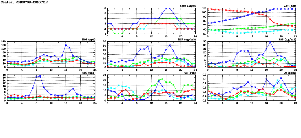 | Air Quality Data Time Series in Central (2018/07/12) | ( Line colors: Day -3 Day -2 Day -1 Current day ) | 2D Map Current AQHI |