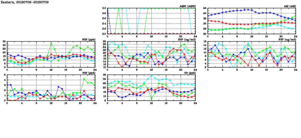| Air Quality Data Time Series in Eastern (2018/07/09) | ( Line colors: Day -3 Day -2 Day -1 Current day ) | 2D Map Current AQHI |