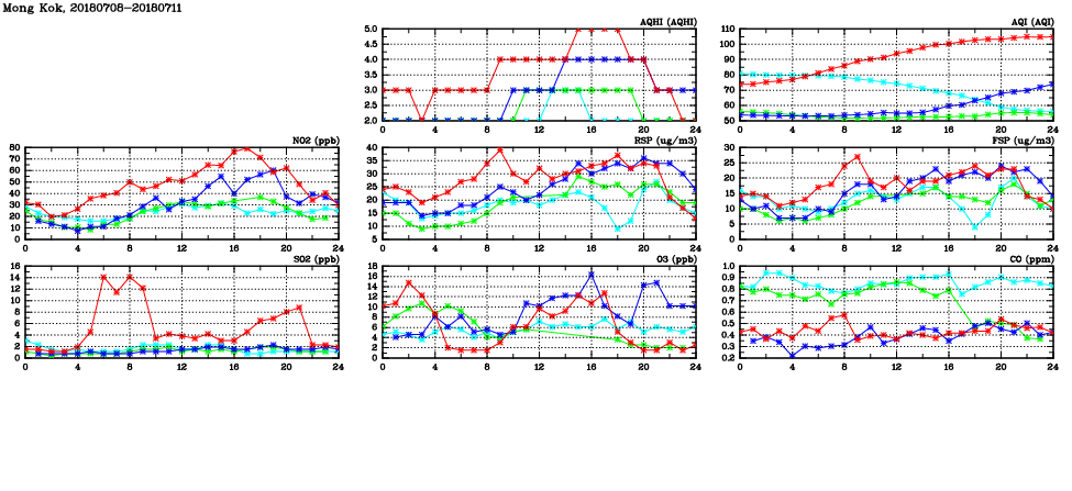 | Air Quality Data Time Series in Mong Kok (2018/07/11) | ( Line colors: Day -3 Day -2 Day -1 Current day ) | 2D Map Current AQHI |