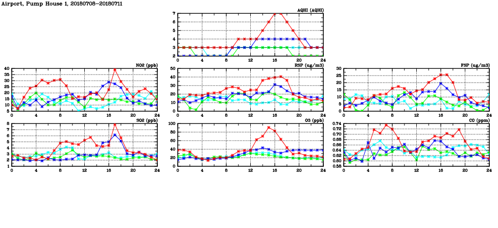 | Air Quality Data Time Series in Airport, Pump House 1 (2018/07/11) | ( Line colors: Day -3 Day -2 Day -1 Current day ) | 2D Map Current AQHI |
