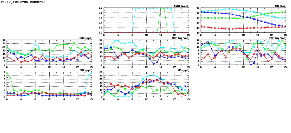 | Air Quality Data Time Series in Tai Po (2018/07/09) | ( Line colors: Day -3 Day -2 Day -1 Current day ) | 2D Map Current AQHI |