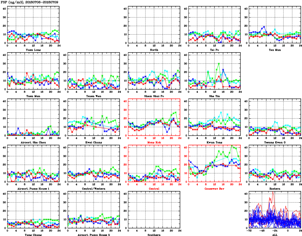 | Air Quality Data Time Series for FSP (2018/07/09) | ( Line colors: Day -3 Day -2 Day -1 Current day ) | 2D Map Current AQHI |