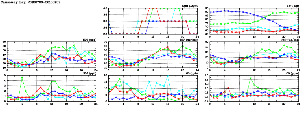 | Air Quality Data Time Series in Causeway Bay (2018/07/09) | ( Line colors: Day -3 Day -2 Day -1 Current day ) | 2D Map Current AQHI |