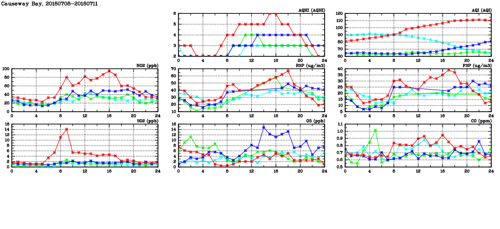 | Air Quality Data Time Series in Causeway Bay (2018/07/11) | ( Line colors: Day -3 Day -2 Day -1 Current day ) | 2D Map Current AQHI |