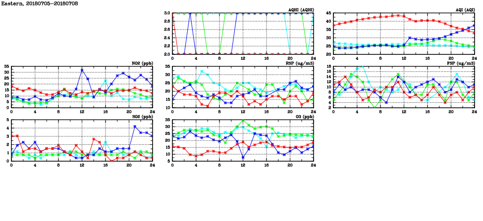 | Air Quality Data Time Series in Eastern (2018/07/08) | ( Line colors: Day -3 Day -2 Day -1 Current day ) | 2D Map Current AQHI |