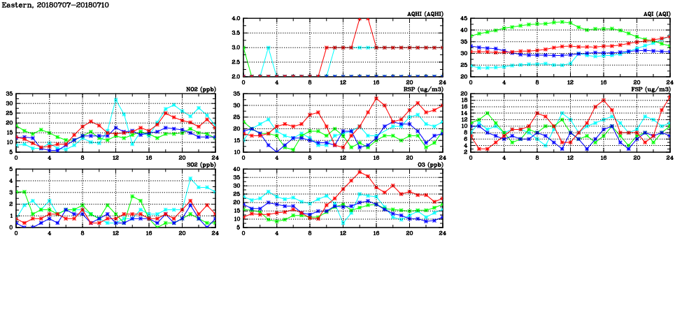 | Air Quality Data Time Series in Eastern (2018/07/10) | ( Line colors: Day -3 Day -2 Day -1 Current day ) | 2D Map Current AQHI |