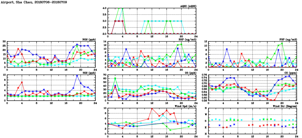 | Air Quality Data Time Series in Airport, Sha Chau (2018/07/09) | ( Line colors: Day -3 Day -2 Day -1 Current day ) | 2D Map Current AQHI |