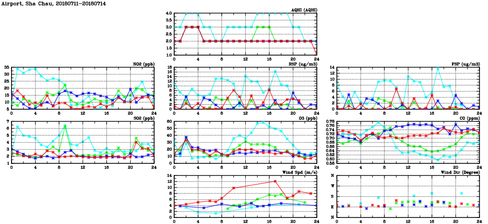 | Air Quality Data Time Series in Airport, Sha Chau (2018/07/14) | ( Line colors: Day -3 Day -2 Day -1 Current day ) | 2D Map Current AQHI |