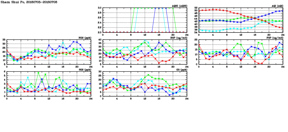| Air Quality Data Time Series in Sham Shui Po (2018/07/08) | ( Line colors: Day -3 Day -2 Day -1 Current day ) | 2D Map Current AQHI |