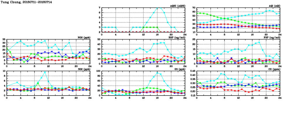 | Air Quality Data Time Series in Tung Chung (2018/07/14) | ( Line colors: Day -3 Day -2 Day -1 Current day ) | 2D Map Current AQHI |