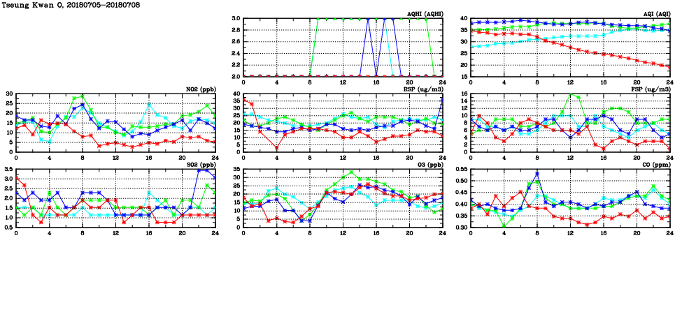 | Air Quality Data Time Series in Tseung Kwan O (2018/07/08) | ( Line colors: Day -3 Day -2 Day -1 Current day ) | 2D Map Current AQHI |