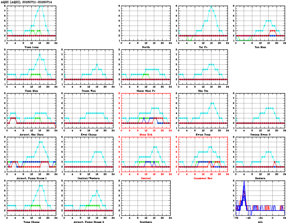 | Air Quality Data Time Series for AQHI (2018/07/14) | ( Line colors: Day -3 Day -2 Day -1 Current day ) | 2D Map Current AQHI |