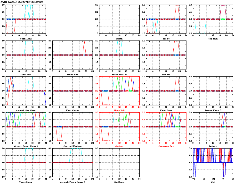 | Air Quality Data Time Series for AQHI (2018/07/15) | ( Line colors: Day -3 Day -2 Day -1 Current day ) | 2D Map Current AQHI |