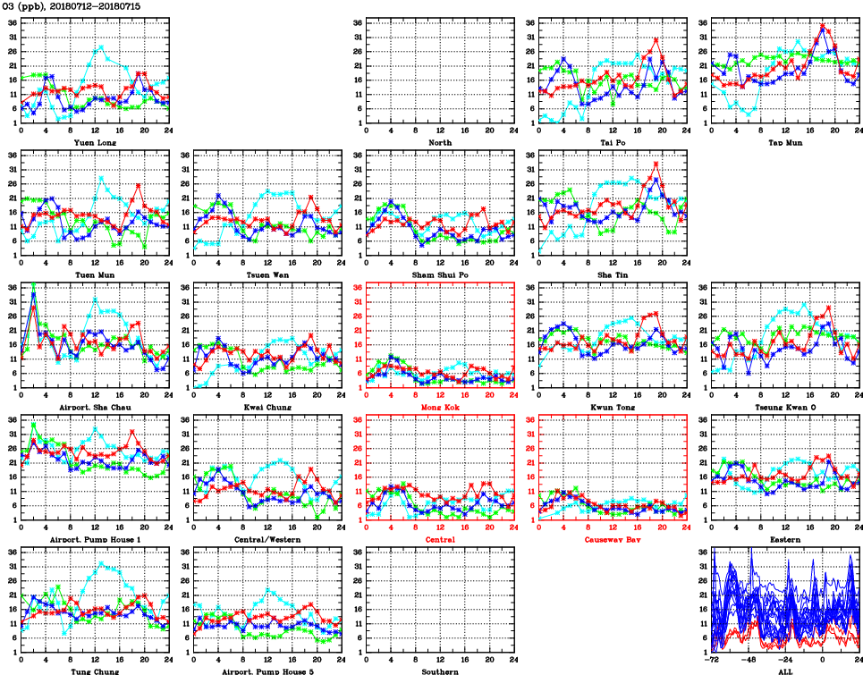 | Air Quality Data Time Series for O3 (2018/07/15) | ( Line colors: Day -3 Day -2 Day -1 Current day ) | 2D Map Current AQHI |