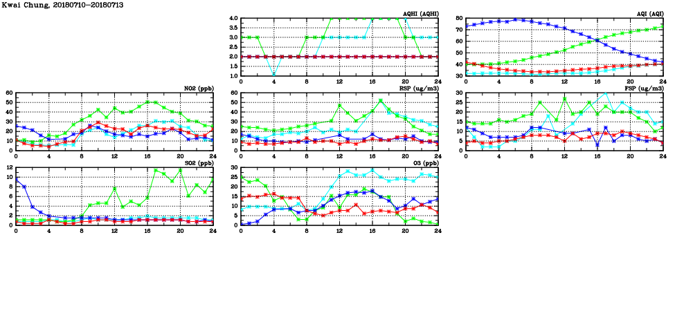 | Air Quality Data Time Series in Kwai Chung (2018/07/13) | ( Line colors: Day -3 Day -2 Day -1 Current day ) | 2D Map Current AQHI |