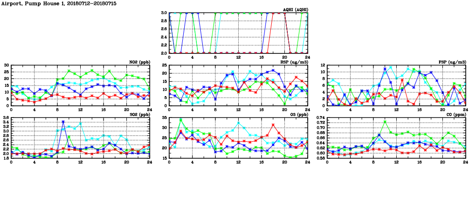 | Air Quality Data Time Series in Airport, Pump House 1 (2018/07/15) | ( Line colors: Day -3 Day -2 Day -1 Current day ) | 2D Map Current AQHI |