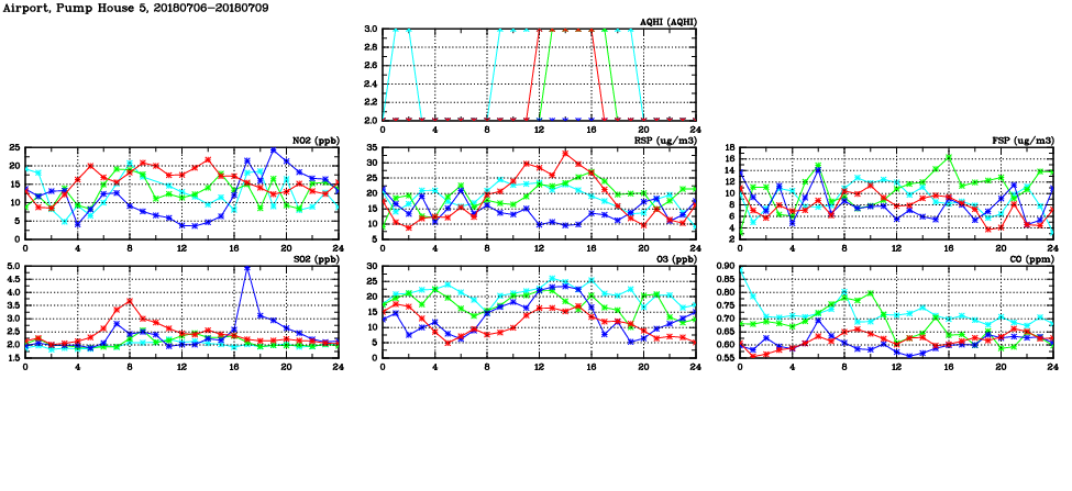 | Air Quality Data Time Series in Airport, Pump House 5 (2018/07/09) | ( Line colors: Day -3 Day -2 Day -1 Current day ) | 2D Map Current AQHI |