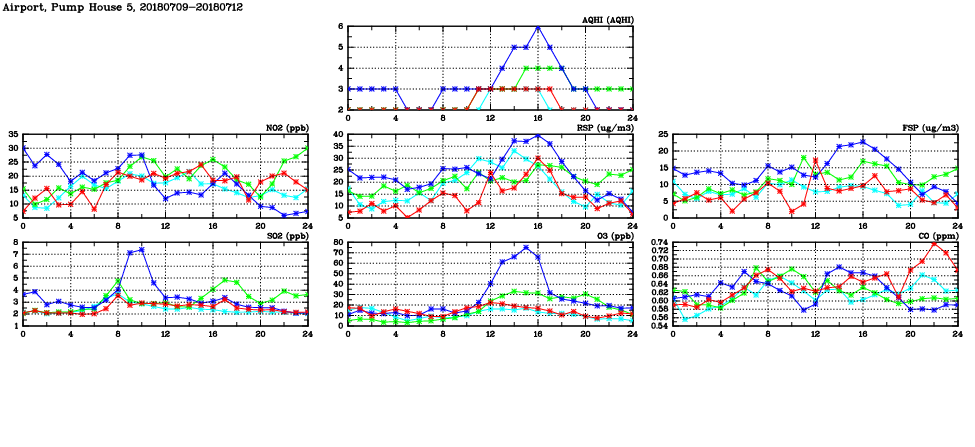 | Air Quality Data Time Series in Airport, Pump House 5 (2018/07/12) | ( Line colors: Day -3 Day -2 Day -1 Current day ) | 2D Map Current AQHI |