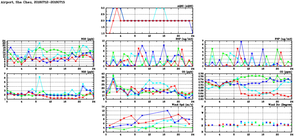 | Air Quality Data Time Series in Airport, Sha Chau (2018/07/15) | ( Line colors: Day -3 Day -2 Day -1 Current day ) | 2D Map Current AQHI |