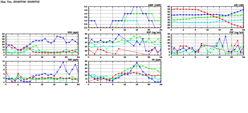 | Air Quality Data Time Series in Sha Tin (2018/07/12) | ( Line colors: Day -3 Day -2 Day -1 Current day ) | 2D Map Current AQHI |