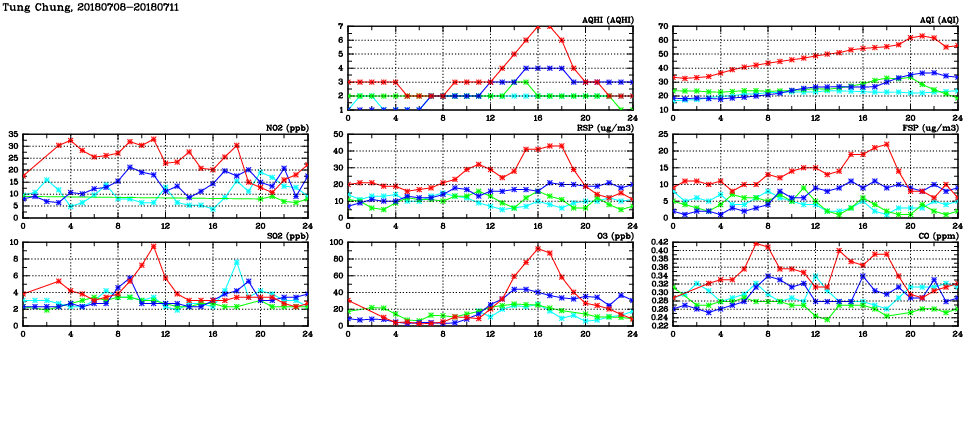 | Air Quality Data Time Series in Tung Chung (2018/07/11) | ( Line colors: Day -3 Day -2 Day -1 Current day ) | 2D Map Current AQHI |