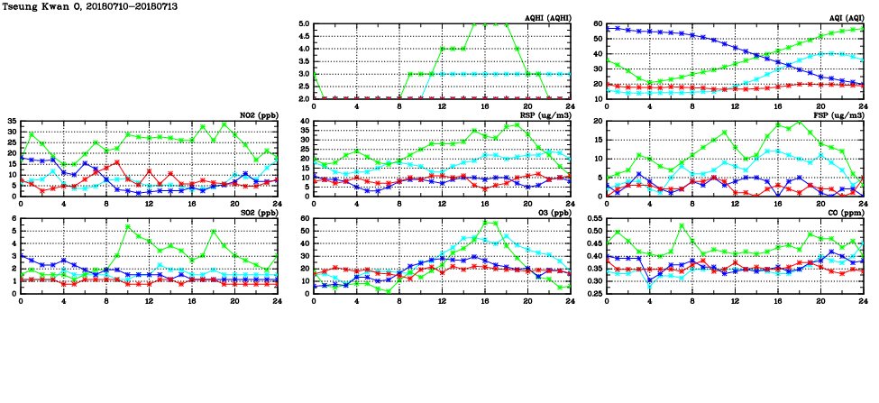 | Air Quality Data Time Series in Tseung Kwan O (2018/07/13) | ( Line colors: Day -3 Day -2 Day -1 Current day ) | 2D Map Current AQHI |