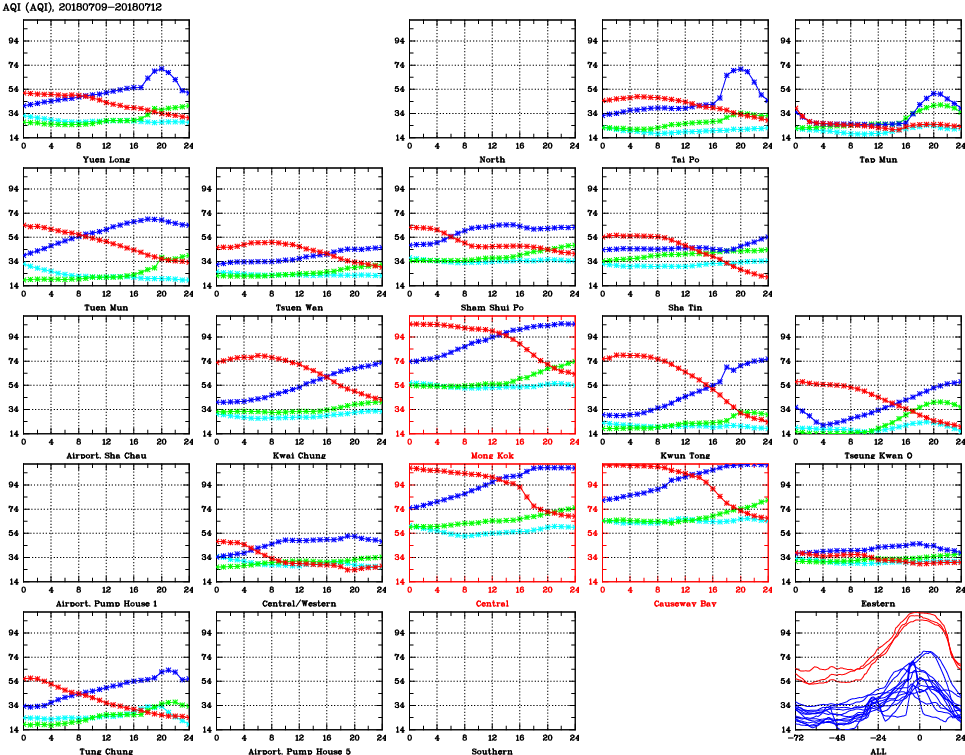 | Air Quality Data Time Series for AQI (2018/07/12) | ( Line colors: Day -3 Day -2 Day -1 Current day ) | 2D Map Current AQHI |